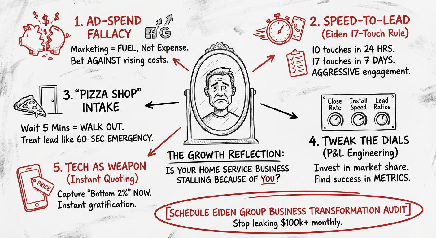 Imagine walking into a pizza shop. If you wait five minutes to be served, you leave. If the shop doesn't offer you wings or a drink (the upsell), they lose the margin. The System Failure: Most contractors pay for the lead (the customer walking in) but fail the service (the intake). The Solution: You need Speed-to-Lead technology (Hatch, Chirp, ServiceTitan) integrated with a 24/7 intake desk that treats a lead like a 60-second emergency.